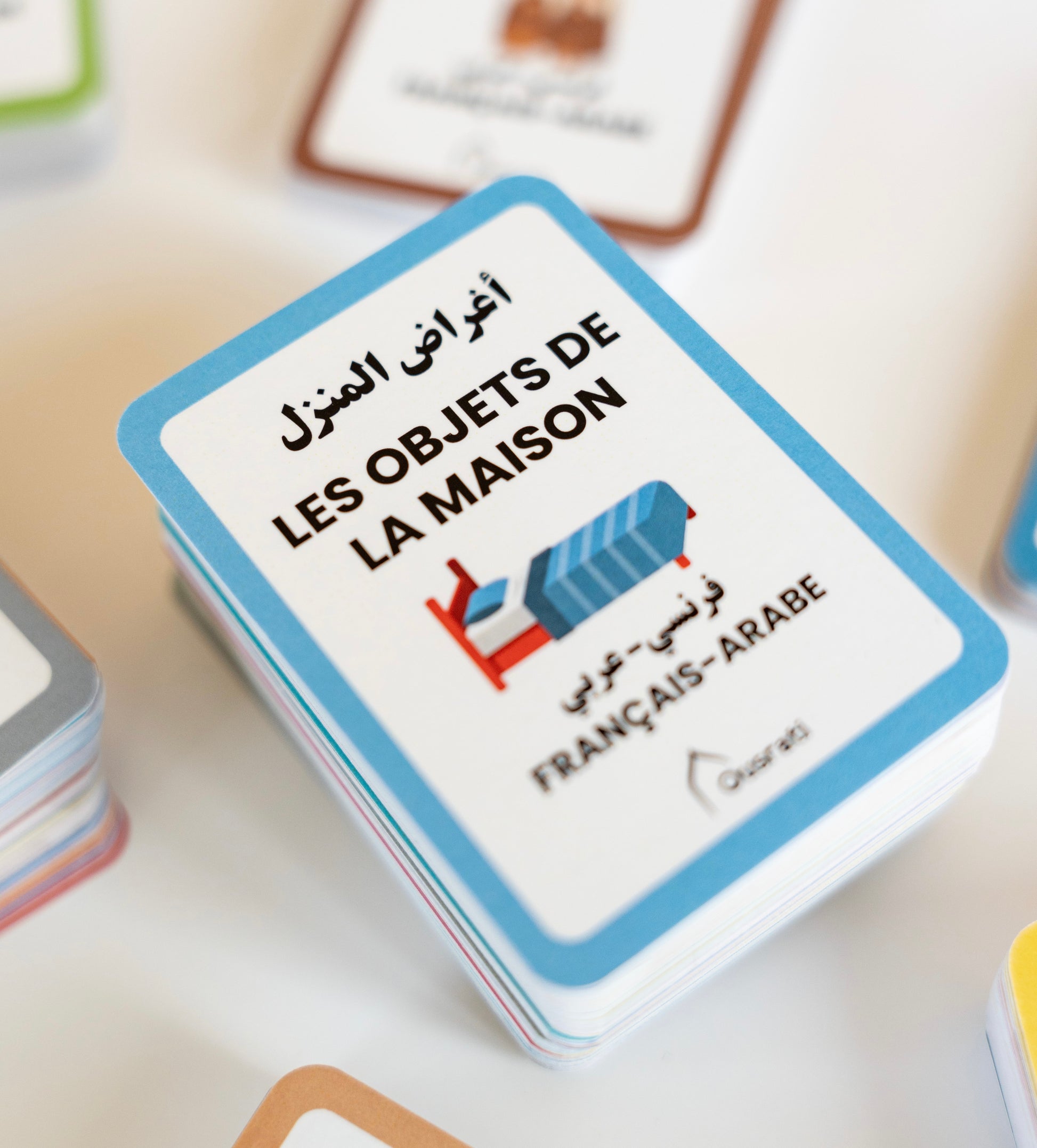Familiarisez-vous avec le vocabulaire des objets courants de la maison avec ces flashcards qui montrent l'objet avec son nom en français et sa traduction en arabe.